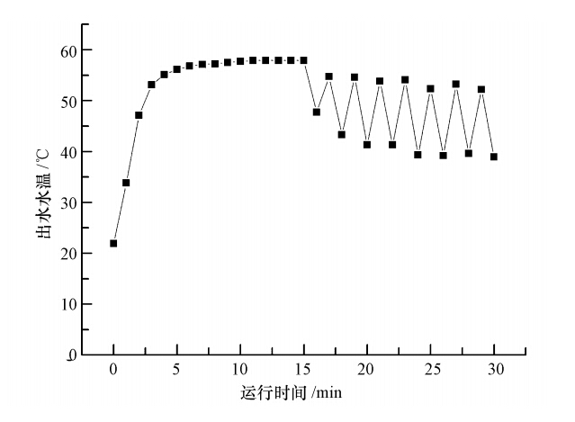 iCWPO對直接紫染料廢水表現出較好的去除效果,驗證了在新型能量傳遞方式下,固液相界面微反應區的高溫環境更有利于CWPO法處理印染廢水.為了實現對染料廢水低能高效降解,充分利用感應熱量,實驗采取間歇式感應熱供能對染料廢水進行催化濕式降解.以自來水為進水,初始水溫21.9℃,記錄感應熱條件下出水水溫的變化情況.在0~5 min出水升溫較快,10 min后達到溫度平衡,15 min后開始間歇1 min供熱,其出水溫度變化如圖 10所示.