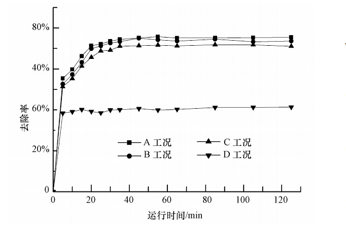 實驗結果顯示,A、B、C工況下的iCWPO運行對比發現出水效果相近,說明在可行時間差范圍內,間歇供熱處理染料廢水得以實現.D出水效果較差,未能實現較好的降解效果,可能是間歇時間太長,溫度太低影響了· OH的生成速率,從而影響了對染料的催化降解.B與C同屬間歇供熱,兩者均能在固定床中達到較好的出水效果,其去除率分別為74.97%和71.86%,但從能量供應的角度看,C比A節約了整體供能的1/2,B比A節約了整體供能的1/3.兩者對比,在染料去除率相差較小的情況下,感應加熱處理1 min間歇處理1 min在提高能量利用率的同時,處理成本將會下降一半左右.具體參見污水寶商城資料或http://www.dongaorq.cn更多相關技術文檔。
