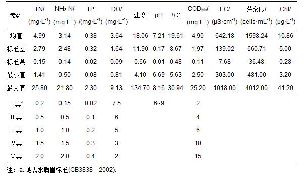 數據來源為古城區2012年30個監測斷面相關數據,11個指標包括總氮(TN)、氨氮(NH3-N)、總 磷(TP)、溶解氧(DO)、濁度(Turb)、pH、水溫(T)、高錳酸鹽指數(CODMn)、電導率(EC)、藻密度(Algae density)、葉綠素(Chl).每月監測1次(12月份數據除外),共3630個(30×11×11)監測樣本,所有樣本的采集及檢測分析嚴格按照地表水環境質量標準(GB3838—2002)中的方法進行實驗室分析,具體結果統計描述見表 1.