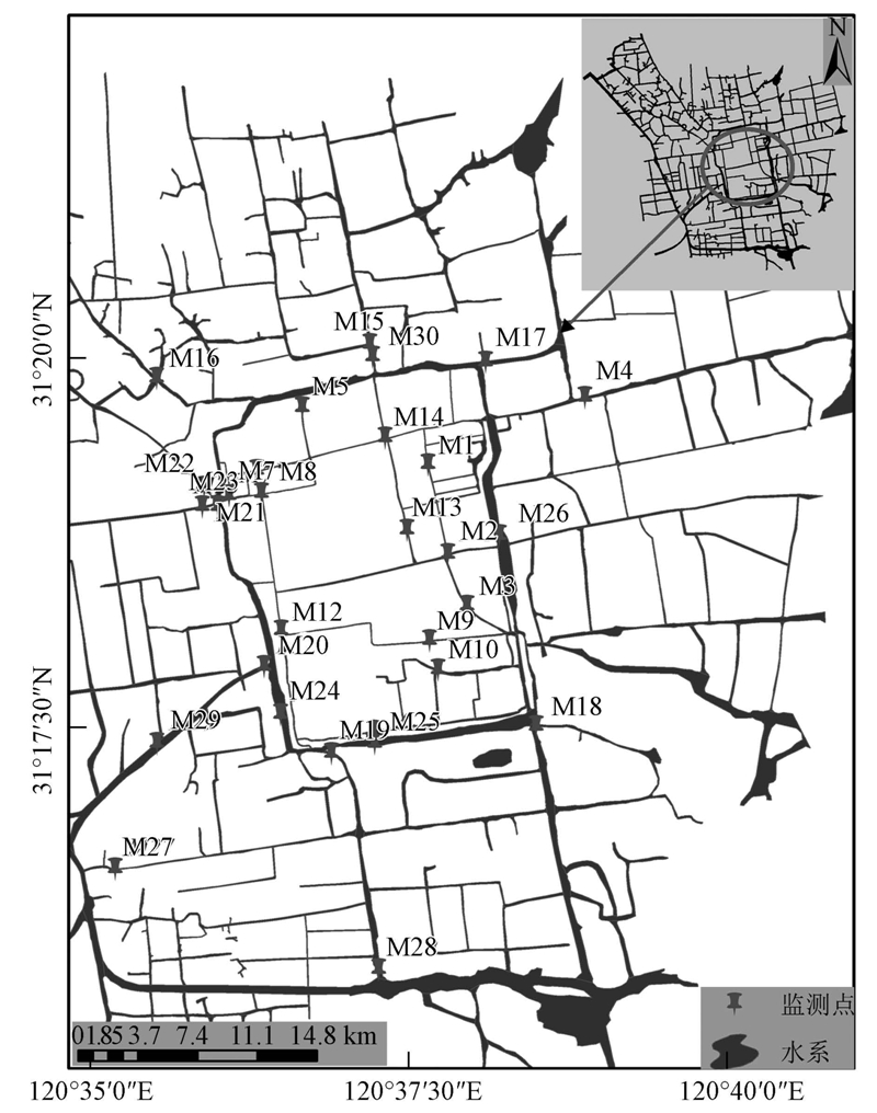 蘇州市地處以太湖為中心淺碟形平原的底部,位于北緯30°47′~32°20′,東經119°55′~121°20′之間,全市地勢低平,自西向東緩慢傾斜;屬于北亞熱帶濕潤季風氣候區,潮濕多雨,季風明顯,具有豐富的雨水資源,平均年降雨量1200~1400 mm,降雨多集中于6—9月份.研究區為蘇州市中心城區,面積大概為10 km2.監測斷面多設在古城區,古城區內河道形成了“一環三橫四縱”的水系布局.河道周邊建筑密集,綠地和可滲透性地面相對較少,水體受潮水頂托與地形影響流向不定,流速緩慢,水體水質惡化嚴重,即便是水體流速較快的外城河、婁江、元和塘、上塘河等城區主要河道也均為Ⅴ類水質.造成水體污染的原因既有包括“三產”污染源及城市生活污染源在內的點源污染,也有城市降雨徑流及河道底泥釋放引起的非點源污染.