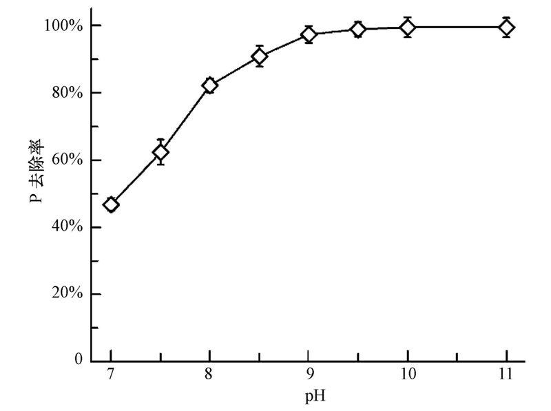 1)溶液pH值對CP結晶沉淀反應中磷的最終去除率有較大影響,隨著pH值的升高,磷的去除率逐漸增加,最佳pH值約為9.5.