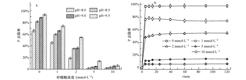 圖 2b所示的是溶液pH值為9.0時不同檸檬酸濃度對磷的去除速率的影響.從圖中可以看出,盡管不同的檸檬酸濃度條件對CP結晶沉淀反應達到平衡的時間沒有明顯影響,沉淀反應基本均在5 min達到平衡; 但隨著溶液中檸檬酸濃度的增加,磷的去除率和反應速率明顯降低.在沒有檸檬酸存在條件下,溶液中磷的去除率在5 min時迅速達到95%以上;而當檸檬酸濃度增加至大于5 mmol · L-1,CP結晶沉淀反應受到強烈抑制,整個反應過程中磷的去除率僅有10%左右.因此,檸檬酸對CP結晶沉淀反應中磷的去除效率和速率均有較大的影響.