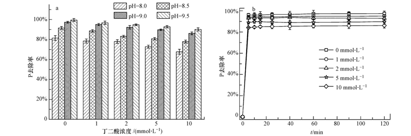 圖 4 不同pH值條件下丁二酸濃度對溶液中磷的去除率影響(a)和pH值為9.0時不同丁二酸濃度對磷的去除速率的影響(b)
