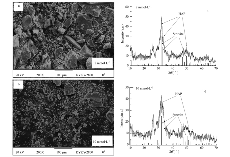 圖 7表示的是溶液pH值為9.0條件下,乙酸濃度分別為2和10 mmol · L-1時所得CP結晶沉淀反應產物SEM照片與XRD分析圖譜.從圖中可以看出,在不同乙酸濃度下得到的結晶產物形貌均呈 不規則塊狀(圖 7a、b),晶體產物的形狀沒有發生明顯變化,但晶粒大小有所不同.隨著溶液中乙酸濃度的增加,反應所得顆粒體積明顯變小,沉淀性能降低.從圖 7c、d可見,通過將X射線衍射圖譜的三強峰與標準峰對照,可以確定晶體結構為磷酸鈣(Ca5(PO4)3OH),結晶產物基本一致.乙酸對結晶產物的形狀及成分均沒有明顯影響,但會影響產物體積大小,進而影響其沉淀性能.具體參見污水寶商城資料或http://www.dongaorq.cn更多相關技術文檔。