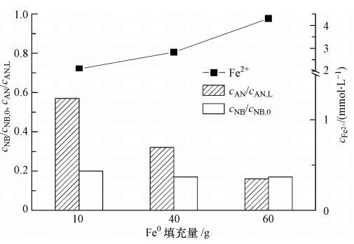 根據(jù)以上研究,體系中Fe2+的濃度將直接影響PS氧化降解AN的效果.進一步改變還原性鐵柱中Fe0填充量,即10、40、60 g,觀察其對產(chǎn)生Fe2+、活化PS及氧化AN的影響,結果如圖 6所示.隨著Fe0填充量的增加,氧化產(chǎn)物Fe2+濃度也隨之增加,最終的NB剩余量基本沒有變化,而還原產(chǎn)物AN卻隨之明顯減少.Liang等(2004a)研究了利用Fe2+分解PS產(chǎn)生SO- ·4降解TCE的反應,在反應體系c(Fe2+)∶ c(PS)= 5 ∶ 4時,降解率能達89%.Fe0填充量分別為10、40、60 g時,F(xiàn)e0被氧化產(chǎn)生的Fe2+與PS的比例c(Fe2+)∶ c(PS)= 2.12 ∶ 3.6、2.83 ∶ 3.6、4.76 ∶ 3.6,AN的最終降解率分別為43%、68%、84%.