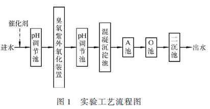 該處理系統是由均相催化臭氧紫外氧化+ 混凝沉淀預處理,再由厭氧和好氧后續處理3 部分組成,廢水經臭氧預處理之前先加入催化劑。實驗裝置見圖1。