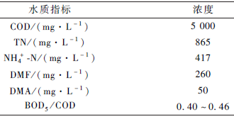 實驗中COD、NH4+ -N 和TN 按第4 版《水和廢水監測分析方法》測定 。COD 采用重鉻酸鉀法測定;TN 采用堿性過硫酸鉀消解紫外分光光度法;NH4+ -N 用納氏試劑比色法;DMF 采用分光光度法;DMA 采用HCl 滴定法。各監測指標均重復測3 次,取平均值作為最終的測定結果。