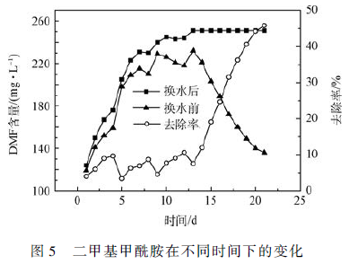 廢水中的DMA 主要由兩部分組成:一部分是廢水中含有一定的DMA,一部分是由廢水中的DMF 氧化分解而來,所以在臭氧催化氧化段會出現DMA 上升的情況,是由于DMF 分解的DMA 還未來得及氧化降解。經臭氧催化氧化DMA 已直觀降解了87. 5% ,生物處理部分由圖5 可知。DMA 的降解較DMF 的降解容易,一方面是由于DMA 的含量相對減少,另一方面DMA 也是由DMF 分解而來。由于廢水濃度的不斷變化引起DMA 的降解出現一定的波動,隨著時間的增加DMA 的降解呈穩定趨勢,出水含量僅有10 mg·L - 1 左右。具體參見污水寶商城資料或http://www.dongaorq.cn更多相關技術文檔。