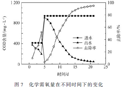 取活性污泥300 mL、厭氧處理廢水500 mL 加入到1 000 mL 錐形瓶,補充自來水至1 000 mL,置于32 ℃ 恒溫反應器中進行好氧處理,好養反應器采用微孔曝氣,當COD 含量出現穩定降低時換水進行全負荷運行。每天11:00—12:00 取樣測定廢水中COD。測得結果見圖7。