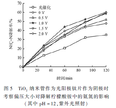 圖5 考察了在去除檸檬酸銨中氨氮的過程中保持其他條件不變改變施加偏壓的大小0 ~ 2. 0 V(0、0. 3、0. 5、1. 0、1. 5 和2. 0 V)對(duì)其去除的影響 。如圖6 所示,與不加偏壓相比,加偏壓時(shí)的光電催化降解效率明顯提高,且隨電壓的增大對(duì)檸檬酸銨中氨氮降解效果而增強(qiáng)。但1. 5 和2. 0 V 偏壓的效果與1 V 的數(shù)據(jù)接近,沒有明顯的提高。在1 V 時(shí)2 h 降解效果可達(dá)60. 2% 。考慮到能耗問題,所以在探索其他條件時(shí)偏壓設(shè)定為1 V。原因在于光強(qiáng)是一定的,光生載荷的總量是固定不變的,再增大電壓不能增加有效分離并遷移到外電路的光生電子數(shù)量,所以降解效果不會(huì)增加。