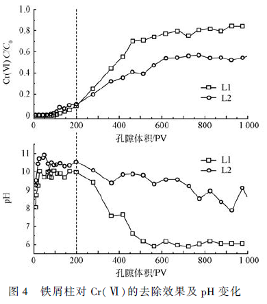 柱實驗在2 個有機玻璃柱中進行。L1 為控制柱通入Cr(Ⅵ)溶液,L2 通入Cr(Ⅵ) + NO3- 的混合溶液。采用鐵屑作為主要反應介質,為了防止鐵屑結塊,將鐵屑與石英砂進行混合。PV 是孔隙體積,1PV = 80 mL。在柱實驗中,PV 常用作時間單位,即1PV 等同于80 mL 溶液通過實驗柱所需的時間。