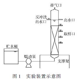 本研究采用硫/ 白云石固定床反應器,實驗裝置如圖1 所示。反應器為有機玻璃柱,內徑140 mm、高1 000 mm、填裝高度500 mm,有效容積約9 L。將硫磺與白云石按質量比1 ∶ 1 混合均勻后裝填入反應器中,填料平均粒徑為5 ~ 8 mm,孔隙率為43. 5% 。反應器運行方式采取上流式并定期對裝置進行反沖洗(方式同進水),裝置上部設有排氣口,出水口高度為0. 6 m。