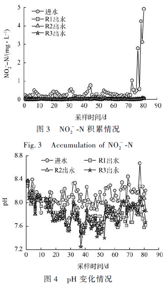 圖3 為反應器NO2- -N 的積累情況。運行初期反應器進水NO2- -N 濃度較低,出水NO2- -N 濃度均小于0. 1 mg·L - 1 ,無NO2- -N 積累。然而從第73 天開始,由于夏季氣溫異常升高(好氧池水溫達到40℃ ),污水處理廠生化系統硝化效果變差,導致反應器進水中NO2- -N 大量積累。但3 套反應器出水中NO2- -N 濃度仍維持在較低的水平,表明反應器對NO2- -N 的去除效果較好。