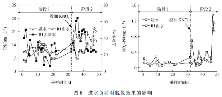 當HRT 為20 min,進水溫度為13 ~ 20 ℃ ,進水pH 為8. 0 ~ 8. 5 時,通過向進水中添加KNO3 改變TN的濃度,共分為階段1 和階段2 兩個階段,考察系統在不同進水負荷下的脫氮效果,結果如圖8 所示。