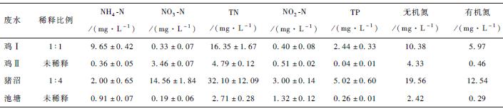 養雞場廢水和養豬場沼液均取自合肥溫氏畜牧有限公司下屬養殖場。其中雞Ⅰ廢水(以下簡稱“雞Ⅰ”)為雞舍污水厭氧發酵處理后,進入第一植物凈化池的廢水;雞Ⅱ廢水(以下簡稱“雞Ⅱ”)為經第一植物池凈化后進入第二植物凈化池的廢水;豬沼廢水(以下簡稱“豬沼”)為豬場通過清糞-沉淀池-酸化池等處理工藝流程排出的沼液經沉淀后的上清液;池塘廢水(以下簡稱“池塘”)為本單位觀賞魚養殖池塘水。