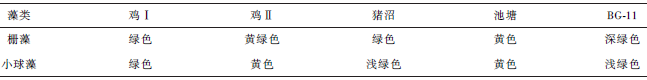 小球藻和柵藻在不同培養基中培養23 d 后,收獲的藻液顏色情況如表2 所示。