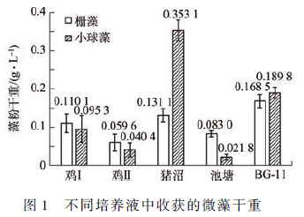 1)微藻在廢水中的生長。在本實驗條件下,柵藻在各廢水培養液中的產量低于BG-11 培養基中的產量。而在豬場沼液中收獲到的小球藻生物量明顯高于BG-11 以及其他培養基中的生物量。