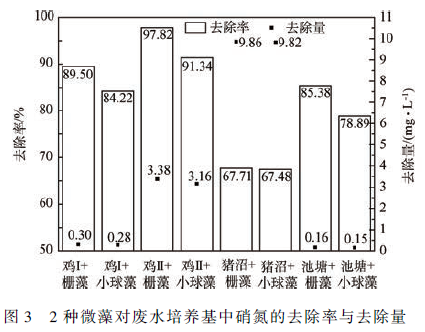 由表1 可見,雞Ⅱ和豬沼培養液中硝氮的濃度大于氨氮濃度,氨氮的抑制作用較弱,2 種微藻對硝氮的吸收利用較多。尤其在豬沼中,雖然2 種微藻的去除率都不高,但是去除的絕對量最多(柵藻9. 86mg·L - 1 ,小球藻9. 82 mg·L - 1 )。對于雞Ⅰ和池塘培養液,雖然氨氮濃度大于硝氮,抑制作用強,但因其初始值很低,故而雖實際的去除量并不大但去除效率高。有研究結果顯示,硝氮較適合普通小球藻的生長。因此,在硝氮含量最高的豬沼培養液中收獲的小球藻藻粉質量也最多。對比2 種微藻對硝氮的去除率發現,柵藻對硝氮的吸收同化效果稍好于小球藻。