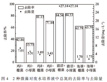 由圖3 可知,在雞Ⅱ培養液中柵藻和小球藻對硝氮的去除率最高。豬沼培養液中,2 種微藻對硝氮的去除率低于其他組,但均在60% 以上。2 種微藻對硝氮的去除效果大致相同,去除量由大到小依次為:豬沼、雞Ⅱ、雞Ⅰ、池塘,均隨著硝氮初始濃度的降低而減少。剩余量除豬沼組(柵藻4. 70 mg·L - 1 ,小球藻4. 74 mg·L - 1 )外,其余各組較少(0. 30 mg·L - 1 左右)。