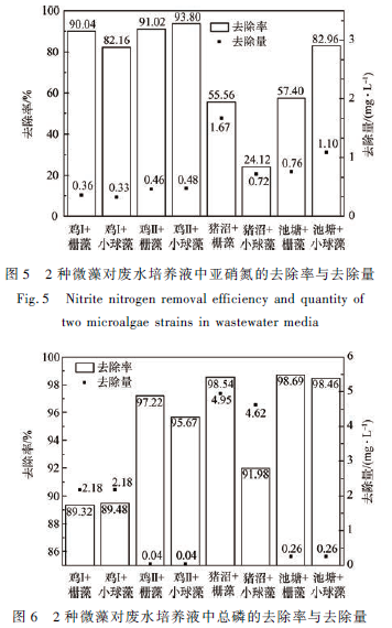 由圖5 可知,柵藻+ 雞Ⅰ組和柵藻+ 雞Ⅱ組以及小球藻+ 雞Ⅱ組中亞硝氮的去除率均在90% 以上。此外,小球藻對雞Ⅰ和池塘培養液中亞硝氮的去除率也在80% 以上。計算得各組亞硝氮減少總量:豬沼和池塘組> 雞Ⅰ和雞Ⅱ組。亞硝氮初始濃度較高的溶液中,2 種微藻對其吸收量多。而初始濃度較低的組,吸收利用率高。