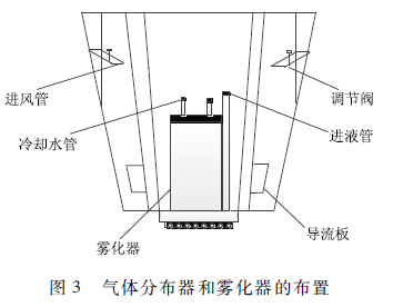 氣體分布器和霧化器的布置如圖3所示,熱空氣通過(guò)若干進(jìn)風(fēng)管和調(diào)節(jié)閥的控制均勻進(jìn)入進(jìn)風(fēng)通道中,通過(guò)導(dǎo)流板的調(diào)節(jié)呈一定角度旋轉(zhuǎn)并與旋流霧化器出來(lái)的霧滴進(jìn)行充分接觸和強(qiáng)烈的傳質(zhì)傳熱反應(yīng)。