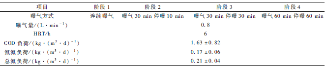 反應器接種城市污水處理廠二沉池回流污泥,初始污泥濃度(MLSS )約為0. 4 g / L 。悶曝24 h后排掉懸浮污泥,連續加入模擬生活污水,水力停留時間為12h,以促進填料上生物膜的形成。掛膜完成后,反應器進入連續穩定運行。穩定運行過程分為4個階段,分別采用不同的曝氣方式(改變曝氣時間/停曝時間),曝氣量均控制在0. 8 L /min,以保證穩定的微氣泡曝氣狀態。各階段運行條件如表1所示。穩定運行過程亦處理模擬生活污水,平均進水COD濃度為407. 7 mg / L ,氨氮(NH3-N)濃度為42. 4 mg/ L , TN濃度為52. 5 mg / L 。反應器在室溫條件下運行。運行過程中,測定進出水溶解氧(DO),COD,NH3-N,TN、硝酸鹽、亞硝酸鹽濃度變化以及電能消耗,以評價反應器運行性能。