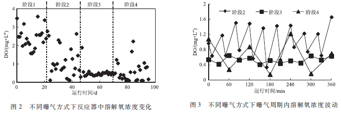 不同曝氣方式下反應器內DO濃度變化如圖2所示。可以看到,采用間歇曝氣方式,隨著停曝時間的延長,反應器內DO濃度明顯下降,階段1至階段4反應器內DO平均濃度分別為2. 47 、 1. 05、0. 54和0. 60mg / L。采用間歇曝氣的階段2一階段4,反應器內DO濃度在一個曝氣周期內波動明顯,如圖3所示。階段2一階段4平均波動范圍分別為0. 65 - 1. 44 、0. 42 - 0. 65和0. 15 - 1. 22 mg / L 。和階段3相比,階段4同時延長曝氣時間和停曝時間,DO濃度波動范圍也隨之明顯增大。DO濃度變化直接影響有機物的好氧降解、硝化和反硝化過程的進行,進而對生物膜反應器的運行性能產生影響。