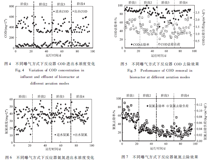 不同曝氣方式下反應器進出水COD濃度、COD去除率和COD去除負荷如圖4和5所示:階段1一階段4,平均出水COD濃度分別為51. 1 ,47.1 ,95. 8和67. 8 mg / L ;平均COD去除率分別為88.5%,87.8% ,75. 3%和82. 0%;平均COD去除負荷分別為1.60,1.35,1.24和1. 29 kg / ( m3·d)。同時,DO濃度與COD的去除負荷存在極顯著正相關關系(R =0. 995,P <0.01 )。因此,隨著間歇曝氣中停曝時間的延長,DO濃度下降是反應器COD去除性能逐漸下降的主要原因。階段4 DO濃度相對階段3較高,COD的去除效果也略優。
