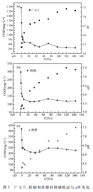 廣玉蘭、梧桐和香樟3種落葉的釋碳軌跡和pH變化規(guī)律,如圖1所示。可以看出,3種碳源物質(zhì)均具有可持續(xù)釋碳能力,在實(shí)驗(yàn)的144 h內(nèi),3種碳源的釋碳規(guī)律較為相似,都是先快速上升,后來逐漸變緩;3種溶液的pH則呈現(xiàn)先直線式下降,后逐漸維持相對(duì)穩(wěn)定的趨勢(shì)。從碳源釋放情況看,廣玉蘭葉的碳源釋放量和速率均遠(yuǎn)遠(yuǎn)高于梧桐和香樟,在浸出第4小時(shí)時(shí),廣玉_的碳源釋放量已達(dá)743 mg / L,單位質(zhì)量碳源釋放量達(dá)到37. 15 mg ·(g ·h)-1,碳源的最高釋放量出現(xiàn)在第120小時(shí),為2 384mg / L,梧桐在經(jīng)歷最初2d的釋放后釋碳逐漸變緩,而香樟則一直呈現(xiàn)小幅增長的趨勢(shì)。最終廣玉蘭葉COD單位釋放量高達(dá)229.2 mg / g,香樟為43.3 mg / g,梧桐最少,只有31.3 mg / g。從pH變化規(guī)律來看,3種落葉浸出液pH值下降的拐點(diǎn)與其浸出液COD升高的拐點(diǎn)幾乎同時(shí)出現(xiàn),表明落葉浸出初期釋放的碳源中含有大量的酸性物質(zhì);落葉pH值變化幅度為:廣玉蘭>梧桐>香樟,側(cè)面反映出廣玉鑄葉的釋酸能力最強(qiáng)。