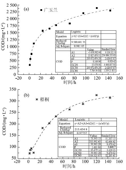 Higuchi模型(見表1)擬合度優(yōu)于二級(jí)動(dòng)力學(xué)模型,此時(shí)廣玉蘭的釋碳速率系數(shù)為174. 69 mg · ( L . h0.5)-1,梧桐和香樟分別為24. 451和31. 459 mg · ( L . h0.5)-1,但廣玉蘭葉的擬合度稍欠佳;考慮到落葉中碳源成分相對(duì)復(fù)雜,最后采用Logistic模型對(duì)3種落葉釋碳特征的曲線進(jìn)行擬合,擬合程度達(dá)到最優(yōu),如表1和圖2所示,該模型是一種阻滯增長模型,是對(duì)指數(shù)增長模型的基本假設(shè)進(jìn)行修改后得到的,它考慮到增長減緩的原因是存在阻滯作用,真實(shí)反映了落葉在釋放碳源過程中可能受限于自身碳源結(jié)構(gòu),水溶液pH值等因素的限制,表明以落葉為碳源的緩釋系統(tǒng)屬于釋放機(jī)制較為復(fù)雜的禍合系統(tǒng)。因此,用Logistic模型可以較好地表征落葉中有機(jī)物在水中的釋放規(guī)律。