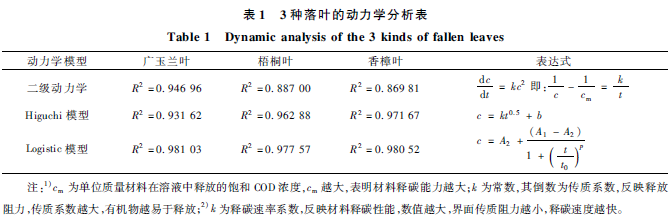 1)在對(duì)比了二級(jí)動(dòng)力學(xué),Higuchi模型和Logistic模型后,發(fā)現(xiàn)Logistic模型能更好地?cái)M合落葉的釋碳過程,3種落葉的擬合度均達(dá)到0. 97以上。