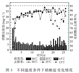 溫度是影響木質(zhì)纖維素物質(zhì)水解效率的一個(gè)重要因素。一般在低溫條件下,生物反硝化效果會(huì)明顯降低。這是因?yàn)槔w維素降解菌大多屬于中溫型細(xì)菌,最適生長溫度在25 - 40℃范圍內(nèi)。過低的溫度會(huì)影響微生物活性,而當(dāng)反應(yīng)溫度處于中溫階段時(shí),細(xì)菌的代謝速率會(huì)隨著溫度的升高而逐漸加快,微生物水解利用碳源物質(zhì)的速率也就隨之加快,體現(xiàn)在反硝化脫氮效率的提高。圖3顯示了在其他條件相同的情況下,以廣玉蘭葉為碳源的3組反硝化污泥分別在15 、25和30℃條件下的硝酸鹽去除效率。