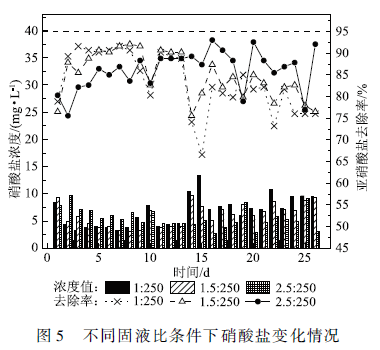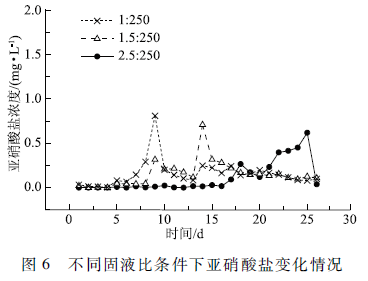 由圖5可知,除了第1天的適應(yīng)期,第2 -8天,落葉投加量與硝酸鹽去除率呈現(xiàn)負(fù)相關(guān),固液比為1 : 250和1.5:250兩組的硝酸鹽去除率一直維持在90%左右,基本無亞硝酸鹽積累(見圖6),而2. 5 : 250組對(duì)應(yīng)的硝酸鹽去除率在85%左右。分析原因,反應(yīng)初期,落葉表面碳源物質(zhì),包括有機(jī)酸類逐漸向水相中釋放,根據(jù)落葉浸出過程中pH的釋放曲線(見圖1),2.5:250固液比系統(tǒng)pH值在浸出第4小時(shí)就會(huì)從7. 49下降到5. 9左右,而反硝化適宜的pH值一般在7. 0一8. 5 ,低于6. 0,反硝化效率將明顯降低。據(jù)此推測(cè),前期2.5:250固液比系統(tǒng)反硝化效率低的主要原因是pH值較低影響到反硝化菌的代謝活性;第9一14天,3組固液比條件下出水硝酸鹽濃度相當(dāng),但隨著釋碳速率變緩,1 : 250和1.5:250固液比組出現(xiàn)低濃度亞硝氮積累現(xiàn)象(見圖6);從第15天開始,硝酸鹽去除率與投加量已漸呈正相關(guān)關(guān)系,此時(shí)固液比為2.5:250組其系統(tǒng)中的碳源物質(zhì)濃度對(duì)于反硝化較為適宜,所以硝酸鹽去除率高于另兩組。由此可見,由于廣玉鑄葉釋酸的特性,過高的固液比會(huì)顯著降低溶液的pH值,從而影響到初期反硝化效率,因此,合適的固液比應(yīng)該既能維持釋放碳源在一定范圍內(nèi),同時(shí)不會(huì)引起溶液pH值的顯著變化。