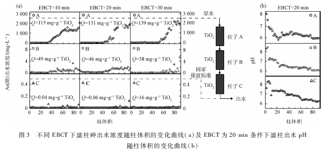 當第1個柱子(A)達到吸附飽和時,EBCT分別為10,20和30 min時A柱的最大吸附量分別為115、131和139 mg / g TiO2。相比之下,EBCT在20和30 min時具有比10 min較大的吸附容量,但EBCT在20和30 min時其對應的吸附容量差異并不大,說明當EBCT在20 min時已達到TiO2顆粒的最大利用率。此時,在20 min的基礎上繼續延長EBCT對于提高TiO2顆粒的利用率影響并不大,但對于整體的處理系統來說,延長EBCT,單位時間內處理的水量將變小,進而影響整體處理效率;因此,在保證吸附利用率的前提下,本研究中,EBCT為20 min是較優選擇。在10 、 20和30 min EBCT時出水砷濃度的平均值分別為8. 7 、6. 1和4.2 μg / L,遠低于國家工業廢水排放標準(0. 5 mg / L)。在優化的EBCT =20 min條件下,出水pH在6. 6士0. 5范圍內,符合國家工業廢水的排放標準(6 -9) 。