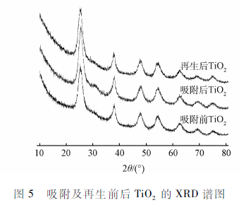 晶型結構的改變對吸附劑表面性質會產生重要影響,從而改變吸附機制及吸附性能。對吸附前后及反洗后的TiO2顆粒進行XRD表征,結果如圖5所示。結果表明,反洗再生后TiO2顆粒的晶型幾乎與吸附前一致,說明Ti02顆粒具有良好的結構穩定性,并且反洗再生實驗表明Ti02對砷的脫附率高達90.6% ,TiO2表面砷的結合位點已重新暴露,可實現對砷的再吸附,從而實現TiO2顆粒的多次重復利用。