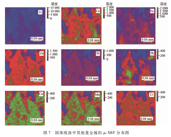 基于同步輻射技術的μ-XRF和μ-XANES分析具備原位分析樣品的元素組成,化學特性,物質結構及其二維分布等的能力,可更加直觀地揭示目標元素在復雜體系中的分布狀態。利用原位μ-XRF對反洗后固體殘渣中的元素組成,物質含量及空間分布進行探究,并采用線性回歸方法分析各元素的相關性。