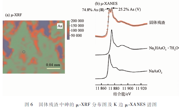 基于同步輻射技術的μ-XRF和μ-XANES數據采集于上海同步輻射(BL15U1 )硬x射線微聚焦及應用光束線站。人射x射線由波蕩器產生,用si(111)單色器選取12 keV的X射線,經K-B鏡聚焦4 μm x 4 μm光斑;固體殘渣樣品的掃描區間大約為0. 6 mmx 0. 1 mm,掃描時間為1 s,步長為4 μm,用硅漂移單兀探測器(SDD , Vortex)采集兀素的特征X射線線信號,用多道分析器記錄。所得μ-XRF數據均采用Igor 軟件進行歸一化處理,再用OriginPro 8作圖并進行數據分析。μ-XANES譜圖采集選取砷K邊的吸收邊(11 867 eV)附近-150一300 eV能量范圍。Na2HAsO4 · 7H2O和NaAsO2作為標準樣品同時采集。采用IFEFFIT軟件包對所獲得的μ-XANES譜進行解析。