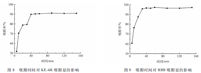 分別取50 mL的50 mg / L的KE-4R和RBB模擬廢水溶液,將其置于150 mL的錐形瓶中,于各自的最適溫度(30 ℃ 、25℃)下振蕩并加人各自最佳投加量(0.3 g、0.1 g)的LDO,每隔一定時(shí)間,取樣,離心,取上清液測定其吸光度,并計(jì)算LDO對(duì)KE-4R和RBB的去除率,繪制吸附曲線,如圖8和圖9所示。