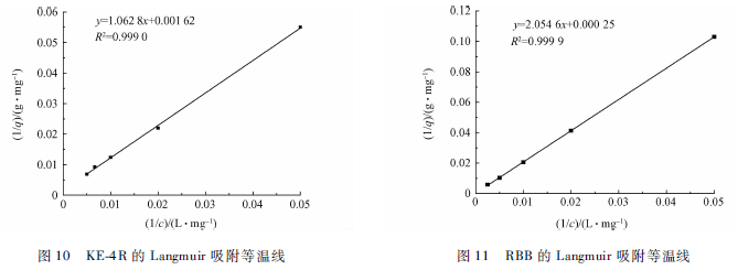 3)吸附等溫式的研究表明,LDO對(duì)KE-4R和RBB的吸附等溫線符合Langmuir等溫式(線性相關(guān)系數(shù)分別為R2 = 0. 999 0和R2 = 0. 999 9 ),屬于單分子層吸附。