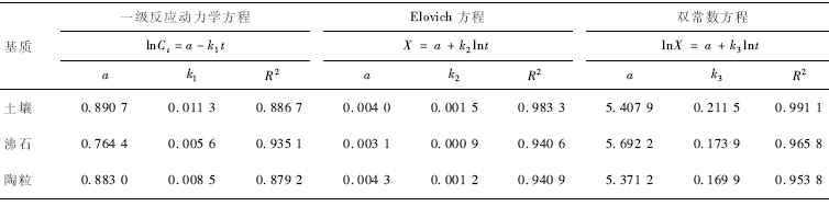 繪制出濕地基質對DBP吸附動力學曲線,并計算出了標準差,見圖3。各濕地基質對DBP吸附的曲線呈現相似趨勢:隨著時間增加,DBP吸附量變大,在20 h左右吸附接近平衡。時間相同時,濕地基質對DBP的吸附量大小順序表現為:土壤>陶粒>沸石。對DBP的吸附速度大小順序表現為:土壤>陶粒>沸石。本文采用Elovich、一級反應動力學、雙常數3個方程來擬合濕地基質對DBP的吸附特征,結果見圖4和表2。