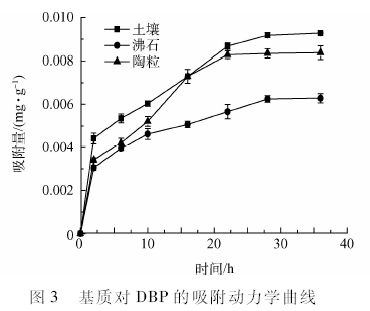 準確稱取105℃下干燥的3種基質各5g分別放于容積為250 mL的錐形瓶中,每種基質做3個平行樣,分別準確加人150 mL質量濃度為600 μg / L 的DBP溶液,加人適量的三氯甲烷用來去除微生物對實驗的干擾,將恒溫振蕩箱溫度設置為25℃、轉速設置為150 r / min,將錐形瓶蓋好塞子振蕩,振蕩0、2、6、10、16、22、28和36 h后取出10 mL過濾,測定DBP的濃度。實驗開始前應對所有要用的容器進滅菌操作。吸附量計算法: