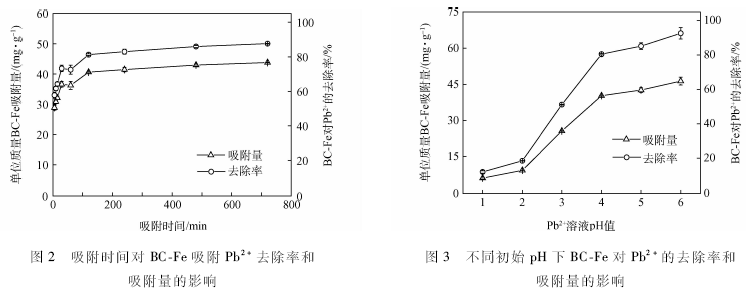 BC-Fe對Pb2+的吸附較快,在吸附時間為5 min時已經(jīng)達(dá)到吸附總量的50%以上,2h時已達(dá)到吸附平衡。去除率以及單位質(zhì)量吸附量的變化趨勢一致。隨著吸附時間的延長,BC-Fe對Pb 2+的去除率逐漸增加,在吸附時間為2h時達(dá)到81.3%,繼續(xù)延長吸附時間,去除率增幅較小,在12h時達(dá)到87.6%,增加了6. 3 %。單位質(zhì)量的BC-Fe對Pb2+的吸附量在吸附時間為2h時達(dá)到40. 6 mg / g ,基本達(dá)到飽和吸附狀態(tài),而后隨吸附時間的延長,在12h時達(dá)到43. 8 mg / g,比2h時增加了3.2 mg。溶液中吸附劑與吸附質(zhì)的結(jié)合是一個漸進(jìn)過程,需要一定的時間才能達(dá)到平衡。由于BC-Fe對Pb2+的吸附可能存在多種吸附機(jī)理,推測在初始吸附階段,主要發(fā)生的是表面吸附,物理吸附占主導(dǎo)地位,Pb2+能快速占據(jù)BC-Fe表面的活性位點(diǎn),隨著吸附時間的延長,BC-Fe表面的活性位點(diǎn)減少,吸附量以及去除率增幅較為緩慢最后達(dá)到平衡。