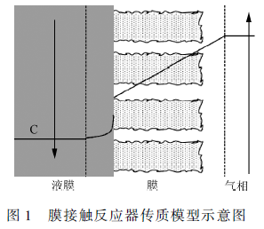 如圖1 所示,在膜接觸反應(yīng)器中,疏水膜將氣液兩相分開,使之獨(dú)立流動(dòng)。氣相側(cè)為臭氧氣體,液相側(cè)為吸收液(水或廢水)。在濃度差的作用下,臭氧從氣相主體跨越氣相邊界層、膜和液相邊界層而進(jìn)入液相主體,繼而發(fā)生物理吸收或化學(xué)反應(yīng)。在擴(kuò)散過(guò)程中,需維持氣相壓力小于液相壓力。有別于傳統(tǒng)反應(yīng)器,在此氣液交換過(guò)程中無(wú)氣泡產(chǎn)生。