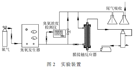 實(shí)驗(yàn)裝置如圖2 所示,經(jīng)臭氧發(fā)生器制備得到一定濃度的臭氧,一部分進(jìn)入臭氧濃度檢測(cè)儀,一部分經(jīng)流量計(jì)定量進(jìn)入膜接觸反應(yīng)器的殼程。吸收液則通過(guò)蠕動(dòng)泵打入膜接觸反應(yīng)器的管程,并通過(guò)恒溫水浴鍋控制吸收液溫度。在膜接觸反應(yīng)器中進(jìn)行臭氧傳質(zhì)并繼而進(jìn)行物理吸收或化學(xué)反應(yīng)。對(duì)于純水,吸收液?jiǎn)未瓮ㄟ^(guò)膜接觸反應(yīng)器后取樣測(cè)試;對(duì)于模擬印染廢水,吸收液循環(huán)多次通過(guò)膜接觸反應(yīng)器,經(jīng)一定的接觸時(shí)間后取樣測(cè)試。含臭氧的尾氣經(jīng)5% 碘化鉀溶液吸收后排空。實(shí)驗(yàn)中,進(jìn)入膜接觸反應(yīng)器的臭氧流量為100 mL·min - 1 。