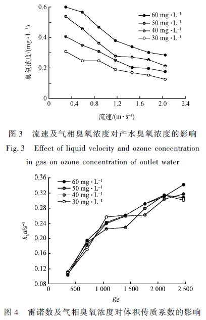 針對(duì)臭氧在膜接觸反應(yīng)器中的傳質(zhì)規(guī)律進(jìn)行探討,分別研究氣相臭氧濃度、液相雷諾數(shù)、液相溫度和膜長(zhǎng)度等因數(shù)對(duì)傳質(zhì)的影響。臭氧傳質(zhì)效果以產(chǎn)水臭氧濃度及體積傳質(zhì)系數(shù)kL a 值定量表示。
