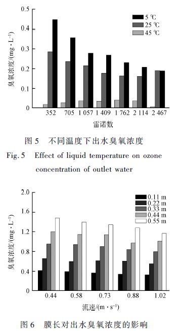 除了流速與臭氧濃度,溫度對(duì)臭氧擴(kuò)散的影響也比較顯著。本實(shí)驗(yàn)氣相臭氧濃度為50 mg·L - 1 ,流量為100 mL·min - 1 。如圖5 所示,隨著溫度升高,出水臭氧濃度隨之減小。臭氧的亨利系數(shù)H 隨溫度變化可描述為[19] : logH = 5. 12 - 1230 / T。而水的飽和臭氧濃度為: C∗ = pozone / H, 其中pozone 為氣相臭氧分壓。隨著溫度升高,水的飽和臭氧濃度下降,傳質(zhì)推動(dòng)力減小,臭氧擴(kuò)散的速率相應(yīng)下降。與此同時(shí),在較高的溫度下,臭氧的穩(wěn)定性變差,臭氧的自分解速度加快 。這2 個(gè)原因共同作用,使得在較高的溫度下,產(chǎn)水臭氧濃度較小。