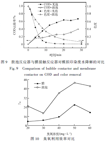 使用面積為2 700 cm2 的膜接觸反應(yīng)器及鼓泡反應(yīng)器在相同條件下(臭氧濃度60 mg·L - 1 ,流量100 mL·min - 1 )處理上述500 mL 剛果紅溶液,降解效果對(duì)比如圖9 所示。經(jīng)過(guò)30 min 反應(yīng),對(duì)于膜接觸反應(yīng)器和鼓泡反應(yīng)器,色度去除率分別為99. 6%和94. 5% ,COD 去除率分別為66. 7% 和39. 4% 。膜接觸反應(yīng)器對(duì)染料的降解速率較高。