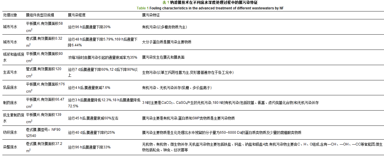 2 納濾膜技術(shù)在廢水深度處理中的膜污染研究現(xiàn)狀(Fouling of nanofiltration membrane in the advanced treatment of wastewater) 2.1 納濾膜技術(shù)在廢水深度處理中的膜污染特征