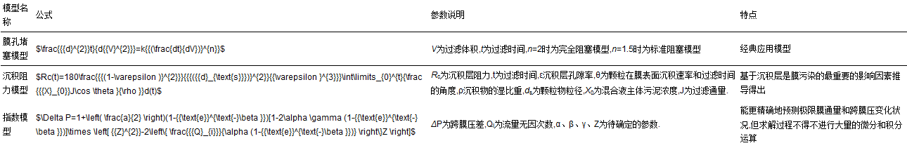 膜污染的數(shù)學(xué)模型可以分為3種:1是從膜的結(jié)構(gòu)、特征出發(fā)描述污染現(xiàn)象的模型,如膜孔堵塞模型、沉積層阻力模型等;2是指數(shù)經(jīng)驗(yàn)?zāi)P?3是計算機(jī)軟件開發(fā)模型,如神經(jīng)網(wǎng)絡(luò)模型和計算流體力學(xué)模型等(陳安穩(wěn)等,2012).常用膜污染模型如表 4所示.