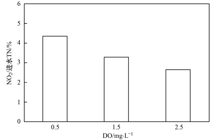 圖 6 去除單位質(zhì)量濃度NH4+-N后N2O的釋放量分析圖 7給出的數(shù)據(jù)可知, 當(dāng)溶解氧為0.5、1.5、2.5 mg ·L-1時(shí), N2O的釋放量占進(jìn)水總氮的比例分別為4.35%、3.27%、2.63%, 由數(shù)據(jù)可知, 當(dāng)溶解氧為0.5 mg ·L-1時(shí), N2O的釋放量占進(jìn)水總氮的比例最大, 而當(dāng)溶解氧為2.5 mg ·L-1時(shí), N2O的釋放量占進(jìn)水總氮的比例最小.隨著溶解氧濃度的升高, N2O的釋放量占進(jìn)水總氮的比例逐漸減少. Law等在小試短程硝化SBR反應(yīng)器內(nèi)處理合成廢水, 控制溶解氧濃度為2.5~3 mg ·L-1, 得出N2O的釋放量占進(jìn)水總氮的比例為1%. Kampschreur等[4]在中試連續(xù)流SBR反應(yīng)器內(nèi)處理廢水, 控制溶解氧濃度為1.0 mg ·L-1, 得出N2O的釋放量占進(jìn)水總氮的比例為3.4%. Desloover等研究短程硝化過程中N2O的產(chǎn)生機(jī)制, 控制溶解氧濃度為0.2~0.4 mg ·L-1, 得出N2O的釋放量占進(jìn)水總氮比例為5.1%~6.6%, 其中45%~47%的NH4+-N氧化為NO2--N, 13%~15%的NH4+-N氧化為NO3--N.可見, 隨著溶解氧的升高, N2O的釋放量占進(jìn)水總氮的比例逐漸減少, 此外, 由于工藝類型和運(yùn)行條件不同, 不同研究者得出N2O的釋放量占進(jìn)水總氮比例也不同.溶解氧濃度不同而產(chǎn)生N2O釋放量差異的原因可能是由于高溶解氧條件下, AOB利用亞硝酸鹽進(jìn)行好氧反硝化作用減弱, 而溶解氧濃度較低時(shí)通常會(huì)促進(jìn)AOB反硝化反應(yīng)而積累N2O.基于以上試驗(yàn)結(jié)果, 從提高污水脫氮效率, 降低N2O產(chǎn)生量來考慮, 短程硝化過程控制溶解氧在2.5 mg ·L-1既可以提高比氨氧化速率, 又可以減少N2O的產(chǎn)生.